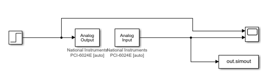On va réaliser un modèle avec un convertisseur numérique-analogique (CNA ici le bloc Analog Output) et un convertisseur analogique-numérique (CAN ici Analog Input). Ces deux blocs se trouvent dans la bibliothèque Simulink Desktop Real-Time.