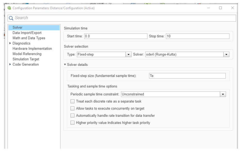 Le paramètre Te sera le pas de calcul de l’horloge interne du PC Cible, soit la période d’échantillonnage. Il faudra le spécifier sous Matlab et sous Simulink :